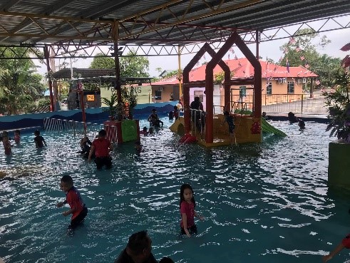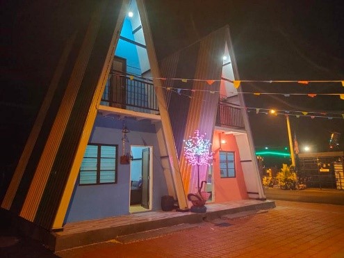 Terdapat homestay dengan binaan segitiga yang menarik, kedai makan dan juga kolam taman tema untuk mandi manda.